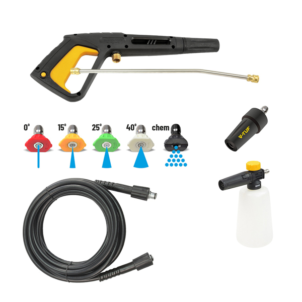 A snow foaming applicator and bottle for easy application of detergent is also included, for use when a cleaning agent is required to help assist in loosening thick grime and dirt, ready for being blasted off by the V5-110v electric pressure washer.