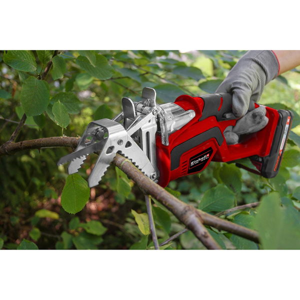 Safe and versatile, the Einhell GE-GS 18 Li cordless pruning saw is a reliable helper in the garden, allowing you to manage & maintain thick foilage & branches more easily.