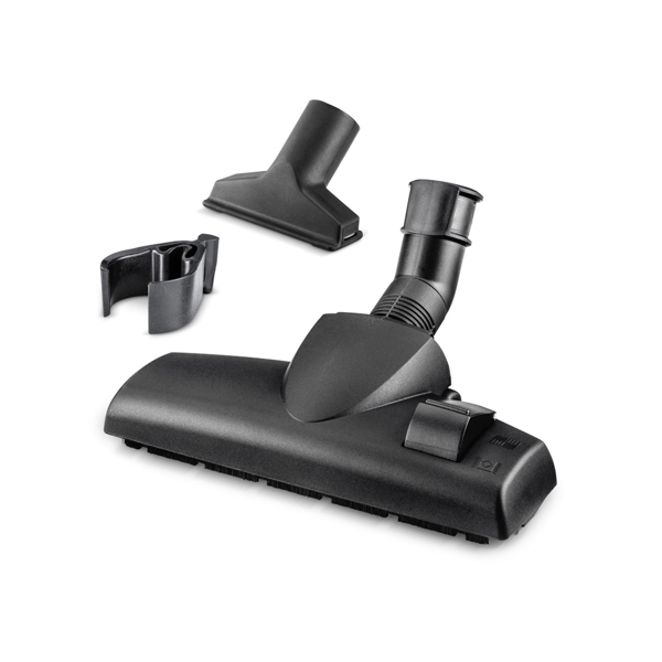 With its switchable dry floor nozzle and upholstery nozzle, the Karcher household vacuum accessory kit includes ideal accessories for lots of common household cleaning tasks. The floor nozzle is switched using a foot switch, making it suitable for both carpeted floors and hard floors, while the practical upholstery nozzle with two thread lifters is ideal for gentle vacuuming on upholstered furniture and other upholstery.