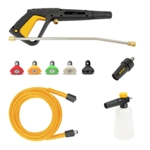 A snow foaming applicator and bottle for easy application of detergent is also included, for use when a cleaning agent is required to help assist in loosening thick grime and dirt, ready for being blasted off by the V5 X2 electric pressure washer. Cleaning brushes (Order Code: H2.021SSQ or H2.022SSQ) for cleaning vehicles, and a patio floor cleaning attachment (Order Code: VXB or VXB-SSQM), can be purchased separately.