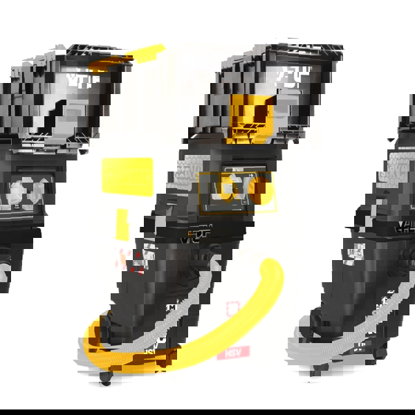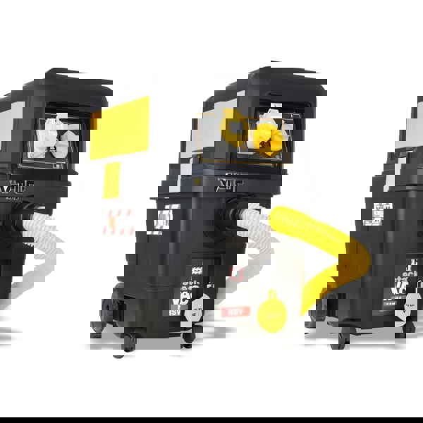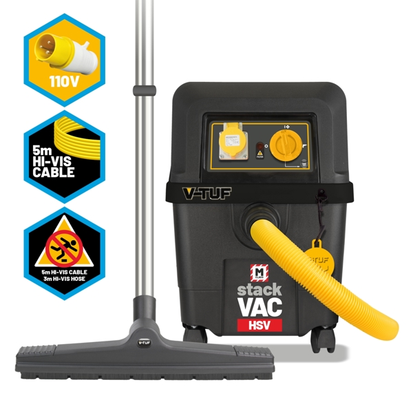 Reduce dust levels in your working environment with the most popular choice for a synchronised dust extractor for using with power tools, the V-TUF 240v StackVac M-Class Vacuum Cleaner. The StackVac M-Class Hepa H13 rated vacuum is portable, tough, rugged, and built to withstand the toughest conditions! With an automatic filter shaker for efficient cleaning, and the option to add the StackPack tool boxes on top for additional storage. The StackVac has been designed to automatically cut the suction 8 seconds after the power tool has been switched off, to ensure 100% dust extraction! The V-TUF M-Class StackVac HSV 110v is lightweight, and compact, and has H13, 99.99%, M-Class Hepa filtration efficiency for safe dust extraction throughout your project, providing powerful dust extraction so you are complying with HSE dust regulations on UK building sites, and, helping to extract the dust at source, ensuring a safe working environment for all. With the (HSE) - UK Health and Safety Executive clamping down regulations on silica dust on buildings sites to M-Class rating as the minimum requirement, unrated vacuum cleaners can exhaust over 80% of harmful dust back into you breathing space. While the tiny dust particles are not visible to the naked eye, they still remain airborne for up to 8 hours, meaning people in the area are inhaling hazardous silica dust particles. DONT RISK IT! The V-TUF M-Class StackVacHSV110 has been designed to protect your health and well being and the future of the workforce in hazardous working environments, offering you affordable compliance and protection from common dust related health issues!