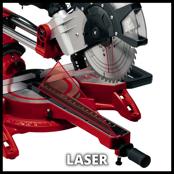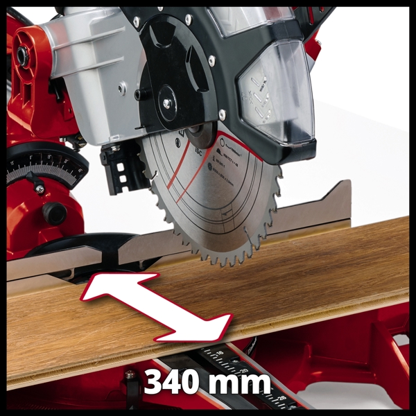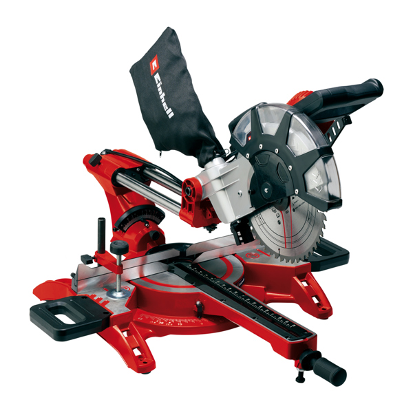 Equipped with a powerful 2,350 Watt motor, the Einhell sliding mitre saw reliably cuts a variety of materials such as wood, laminated panels, and plastics. The mitre saw features easy-to-read scales on both the head and swivel table. A clamping device securely holds the workpiece for safety. Changing the saw blade is effortless with the spindle lock.