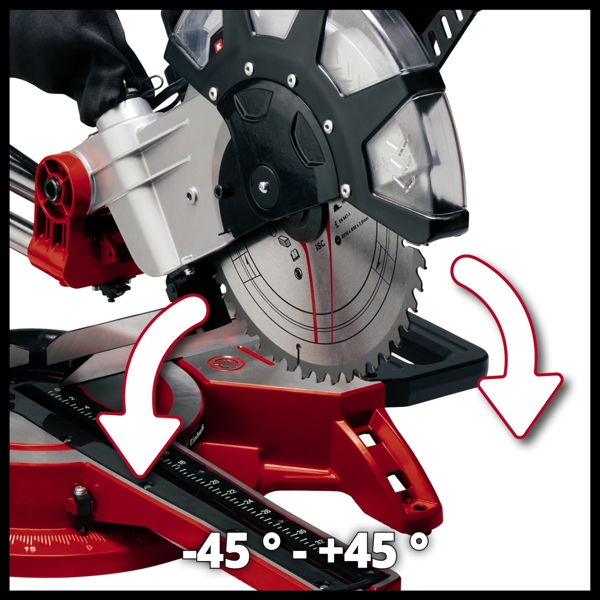 Tiltable saw head The saw head tilts left and right from -45° to 45°: Large workpieces do not need to be rotated and can be processed in any position.