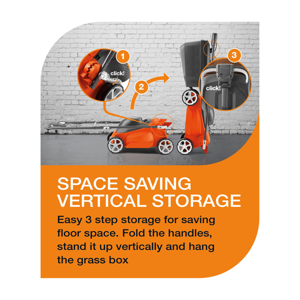 - Easy to store - quickly folds down in 3 steps for saving floor space, simply fold the handles, stand it up vertically & hang the grass box