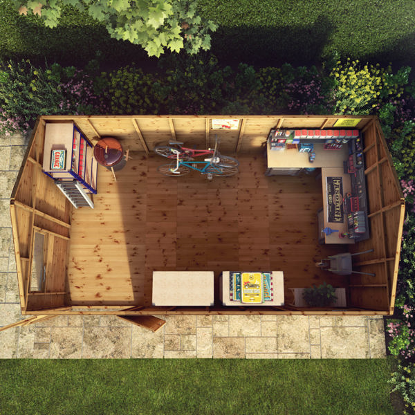 Two shatterproof Styrene glazed windows provide this workshop with a bright interior. The vast size of the internal space is ideal for installing workbenches and additional tool storage. A large set of double doors make accessing your workshop super easy and make this the ideal garden building for your workshop needs.