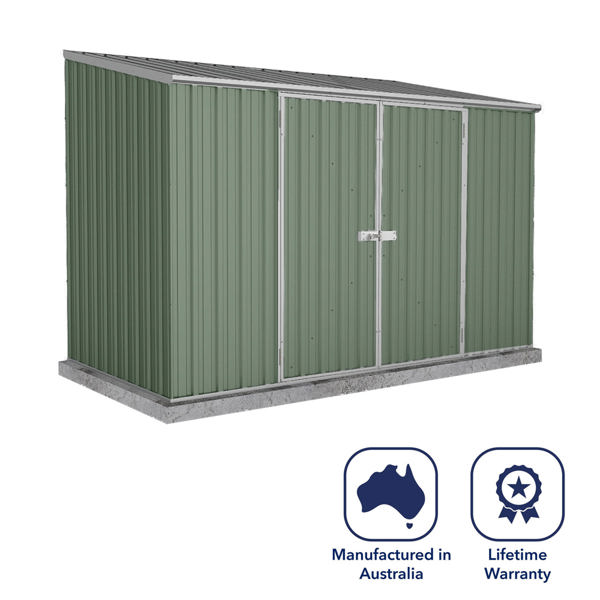 Made from ultra-tough Bluescope Steel, a strong and hardwearing metal, the steel is then coated with a pale eucalyptus colourbond finish paint which helps enhance the durability of this shed and also makes it very low maintenance. The steel used in this shed is also treated making it resistant to rust and water damage.