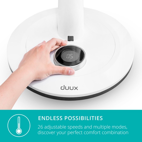 Choose from 26 adjustable speeds and multiple modes, while thanks to the double fan blades, the Whisper has 15 metres of wind reach, cooling even the largest spaces efficiently. The timer can be set from 0 to 12 hours and the fan switches off automatically.